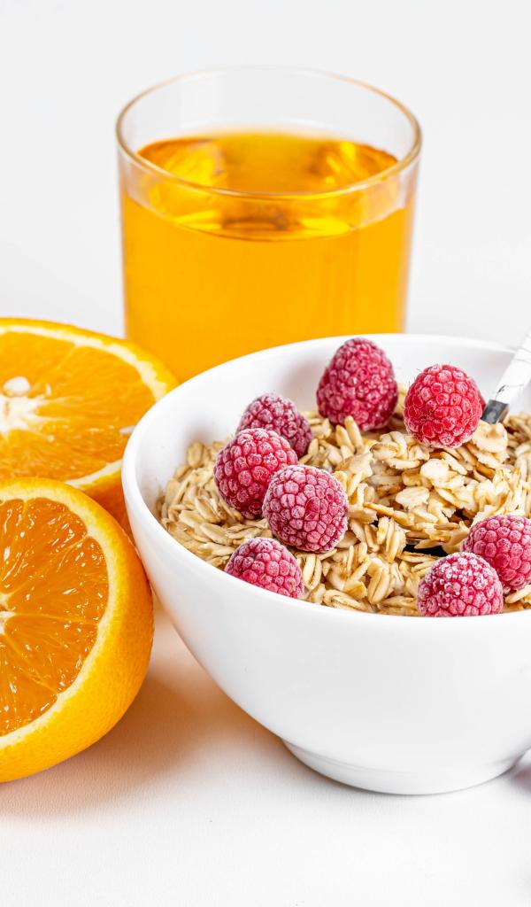Wallpaper Bowl of muesli with raspberries and oranges on a table with juice