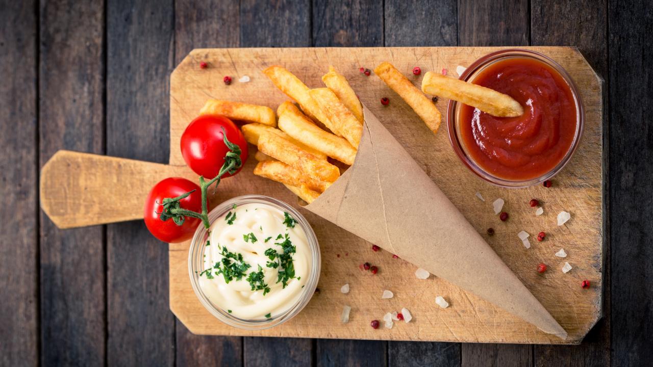 Wallpaper Ketchup, sauce and french fries on a board with tomatoes