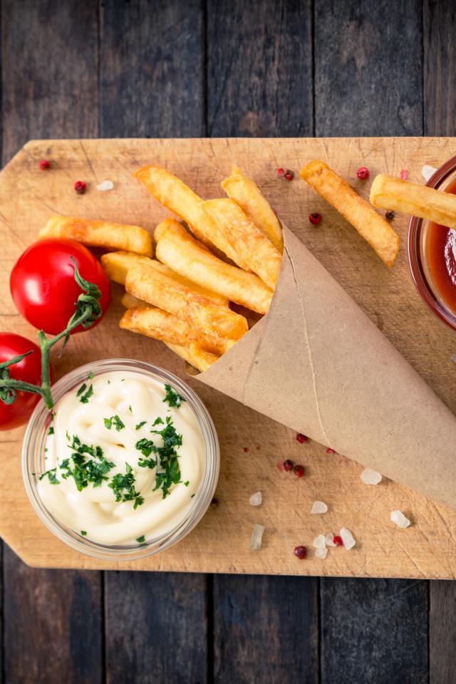 Wallpaper Ketchup, sauce and french fries on a board with tomatoes