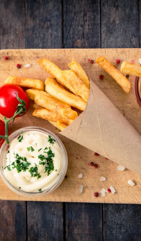 Wallpaper Ketchup, sauce and french fries on a board with tomatoes