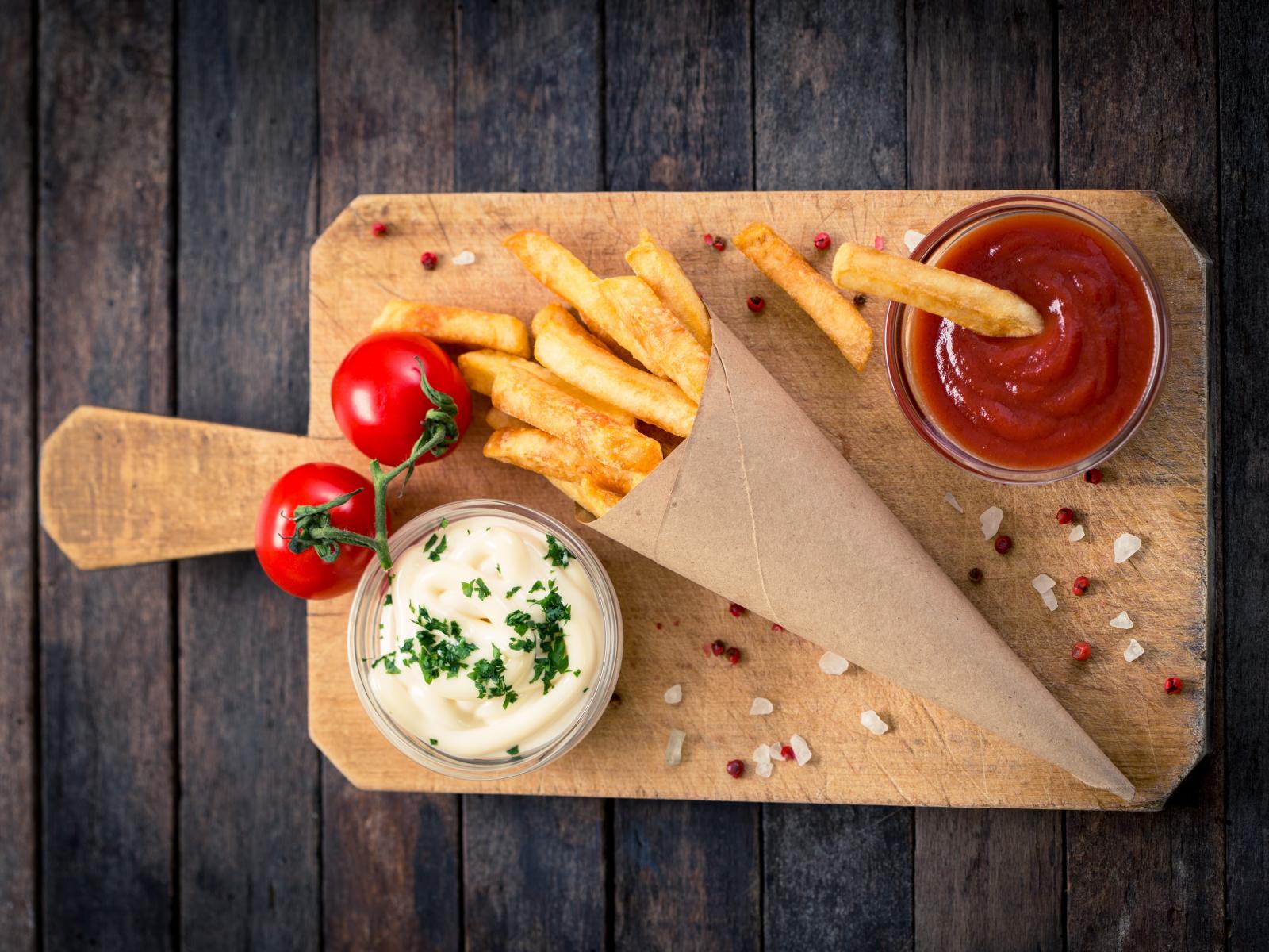 Wallpaper Ketchup, sauce and french fries on a board with tomatoes