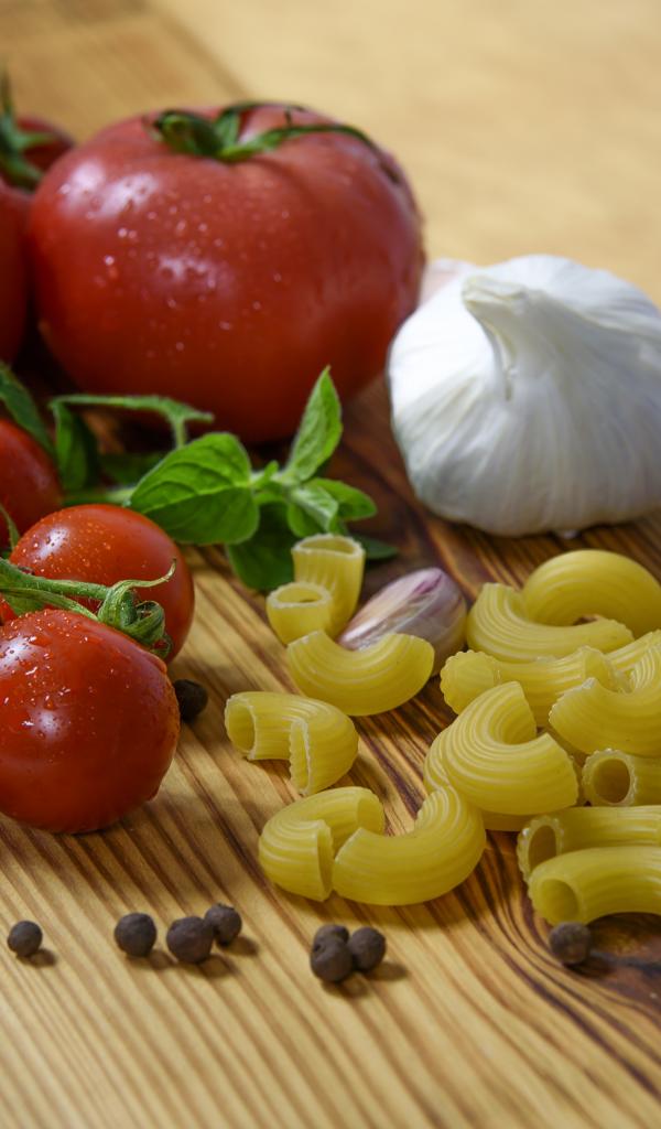 Wallpaper Pasta on the table with tomatoes and garlic