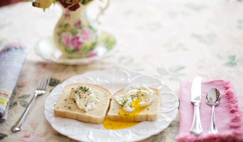 Wallpaper Two slices of bread with fried eggs on a white plate for breakfast