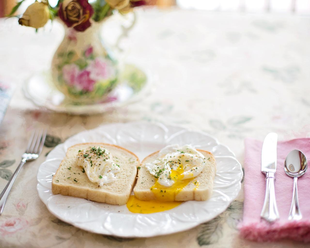 Wallpaper Two slices of bread with fried eggs on a white plate for breakfast