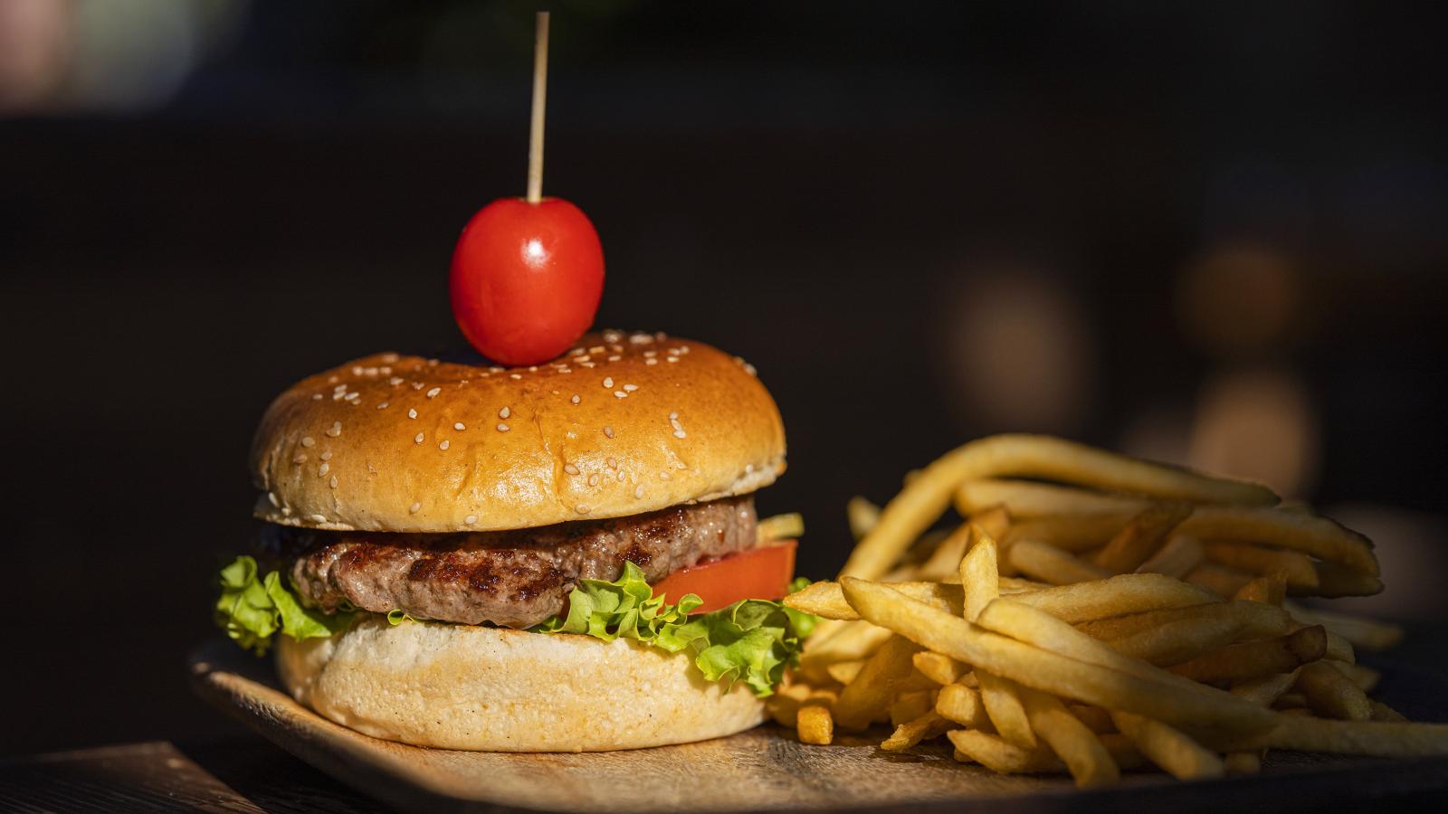 Wallpaper Hamburger with tomato on a board with french fries