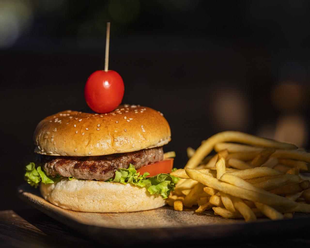 Wallpaper Hamburger with tomato on a board with french fries