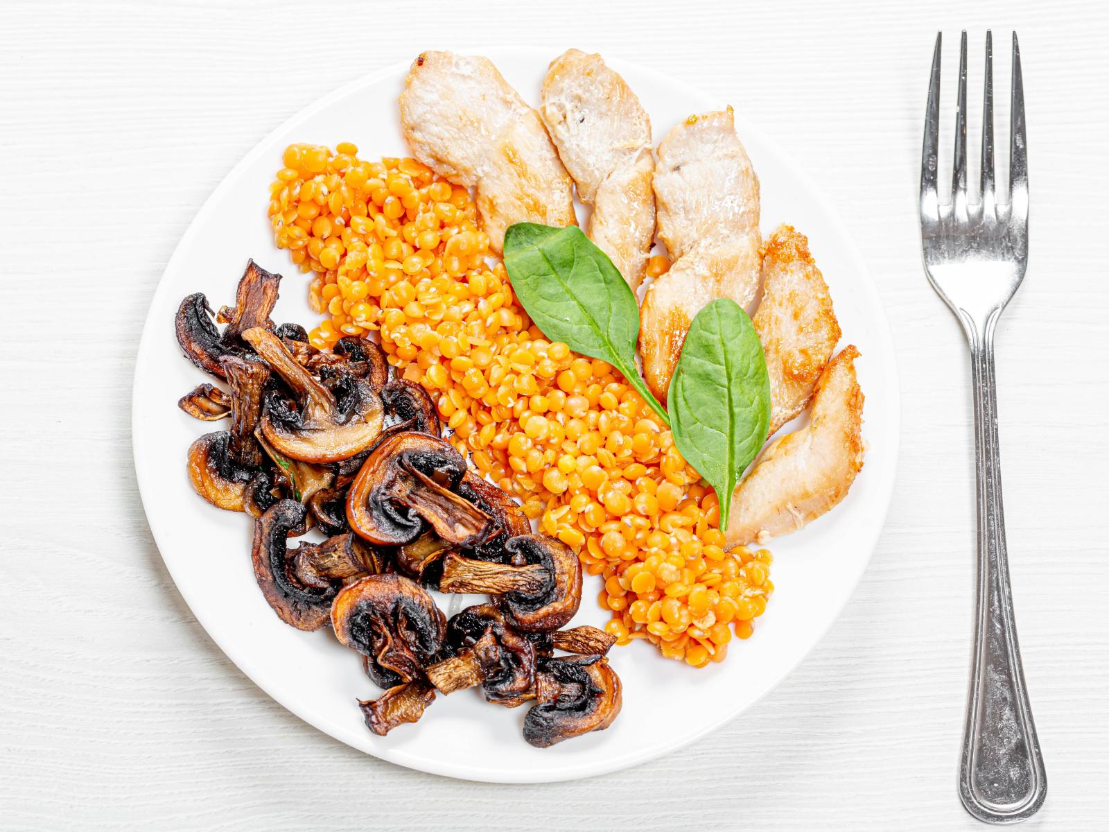 Wallpaper Champignons on a plate with lentils and chicken