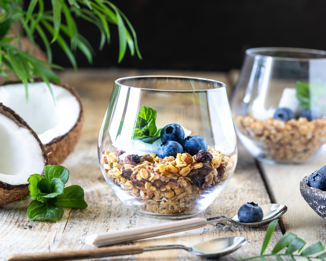 Wallpaper Muesli with blueberries on a table with coconut