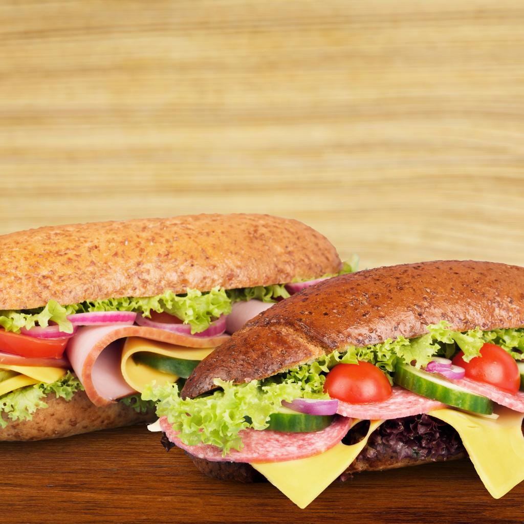 Wallpaper Two delicious sandwiches with sausage and vegetables on the table