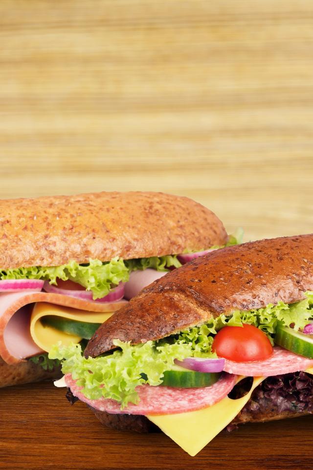 Wallpaper Two delicious sandwiches with sausage and vegetables on the table