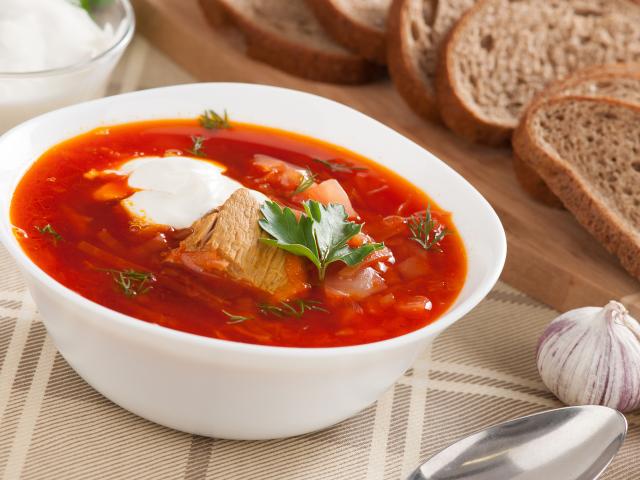 Wallpaper A plate of hot borsch on a table with bread and garlic