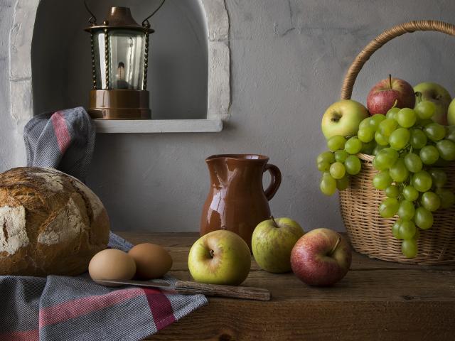 Wallpaper Basket with apples and grapes on a table with bread and eggs