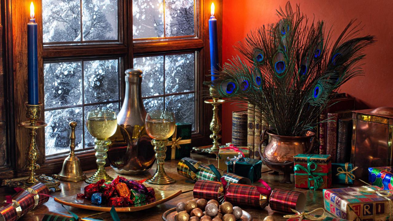 Wallpaper Candies, gifts and antique items on a table by the window