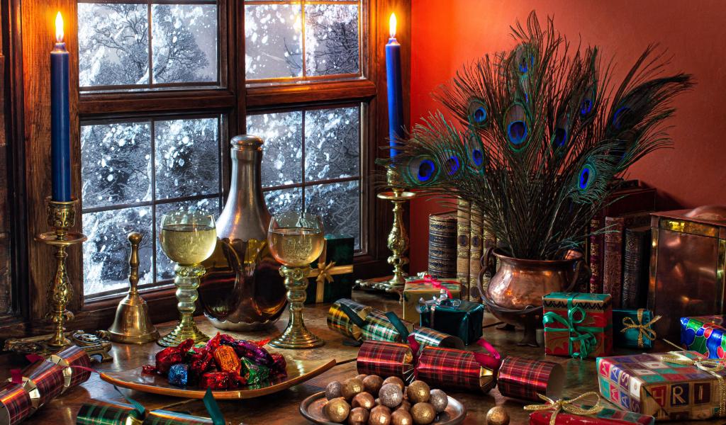 Wallpaper Candies, gifts and antique items on a table by the window