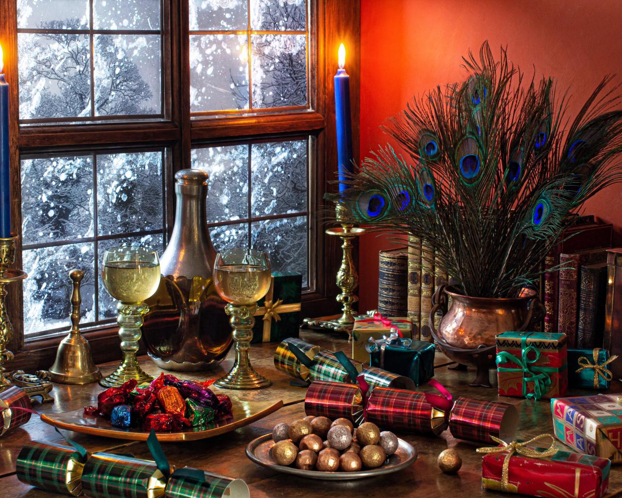 Wallpaper Candies, gifts and antique items on a table by the window