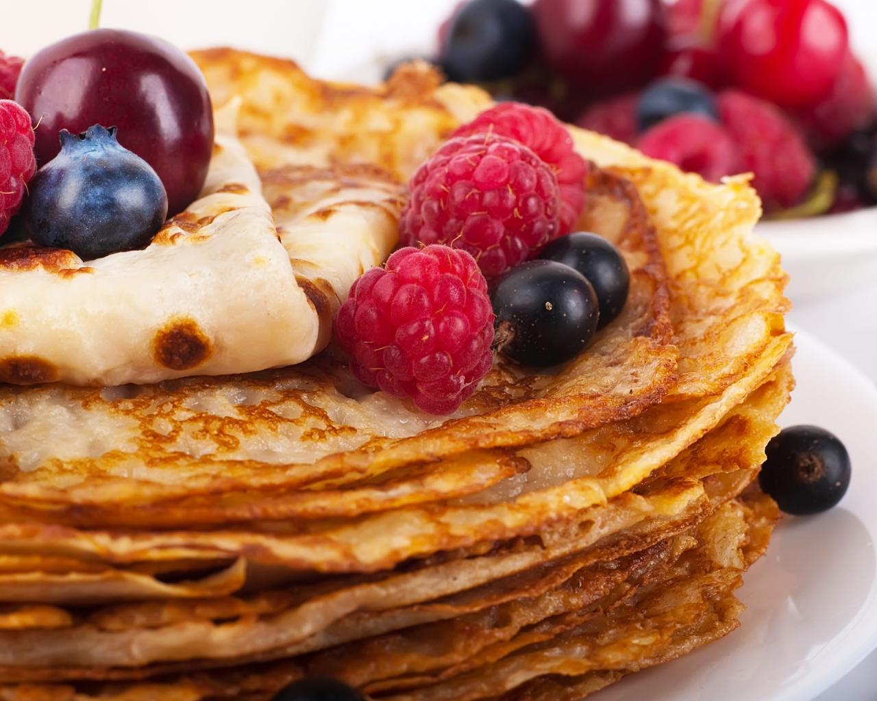 Wallpaper Pancakes with blueberries and raspberries on a white plate