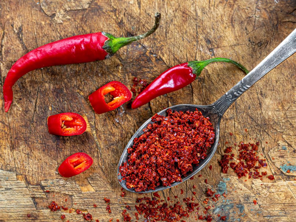 Wallpaper Ground red pepper on a spoon on the table