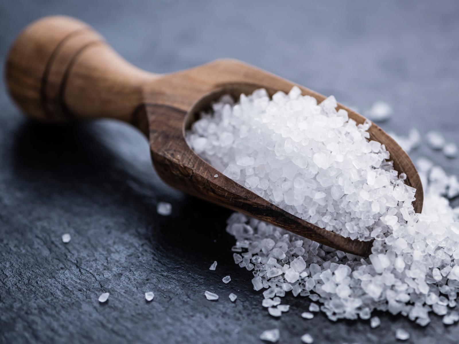 Wallpaper Coarse white salt in a spatula on a table