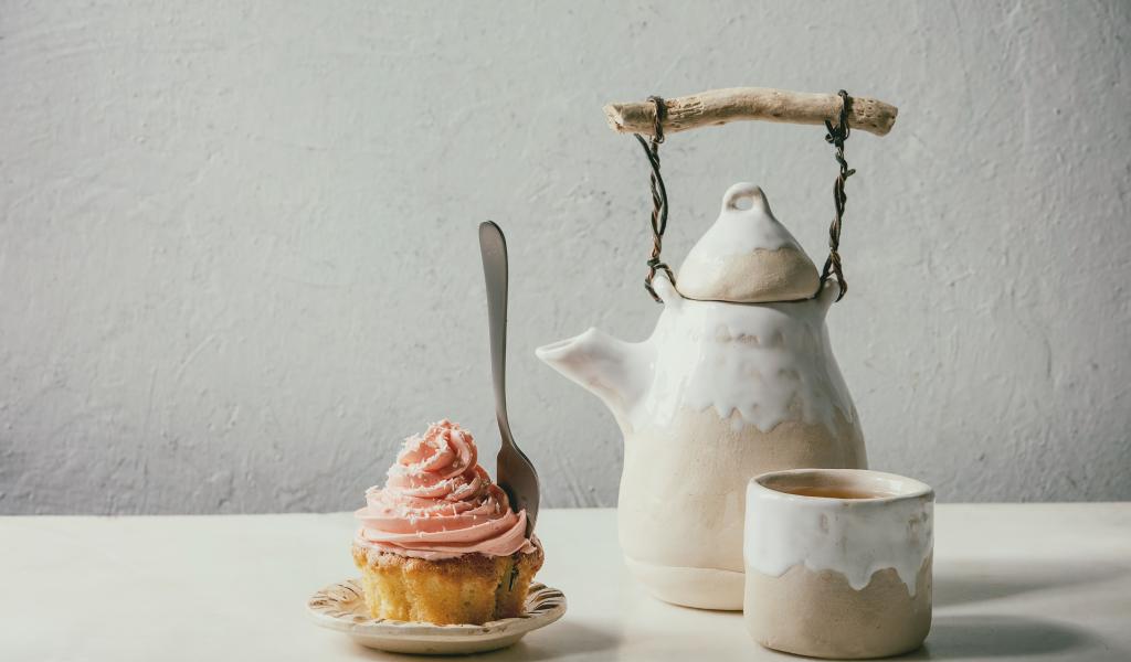 Wallpaper Kettle with a cup on a table with a cupcake