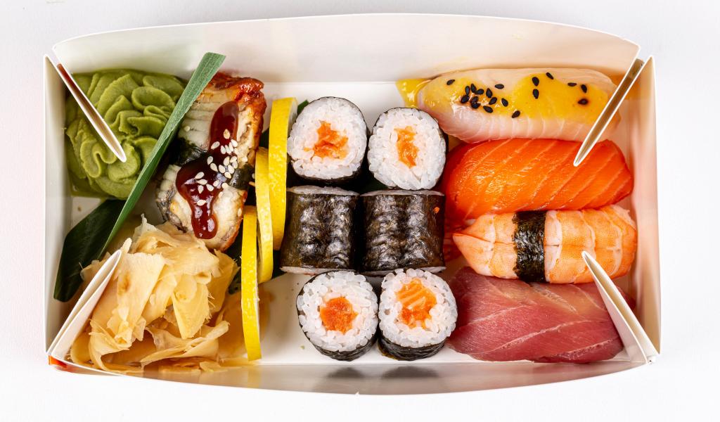 Wallpaper Japanese sushi in a box on a white plate