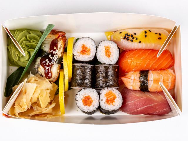 Wallpaper Japanese sushi in a box on a white plate