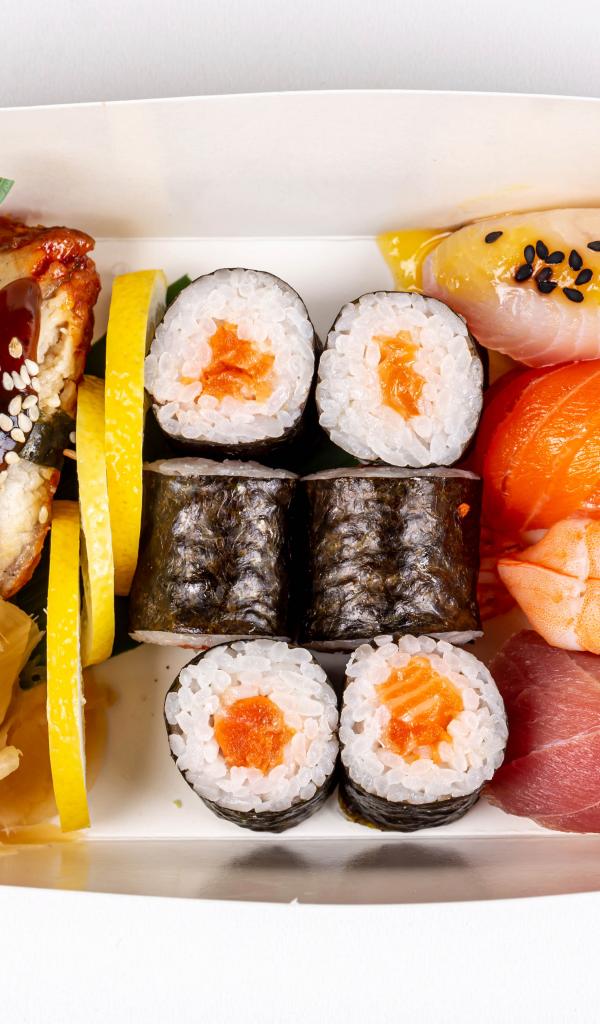 Wallpaper Japanese sushi in a box on a white plate