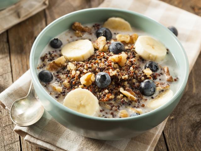Wallpaper Muesli with milk in a plate with blueberries and bananas