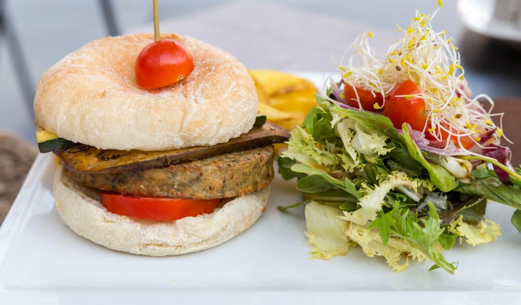 Wallpaper Big hamburger with salad on the table