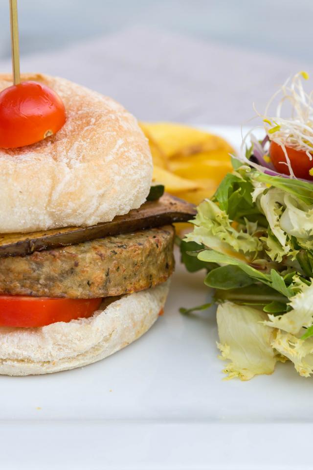 Wallpaper Big hamburger with salad on the table