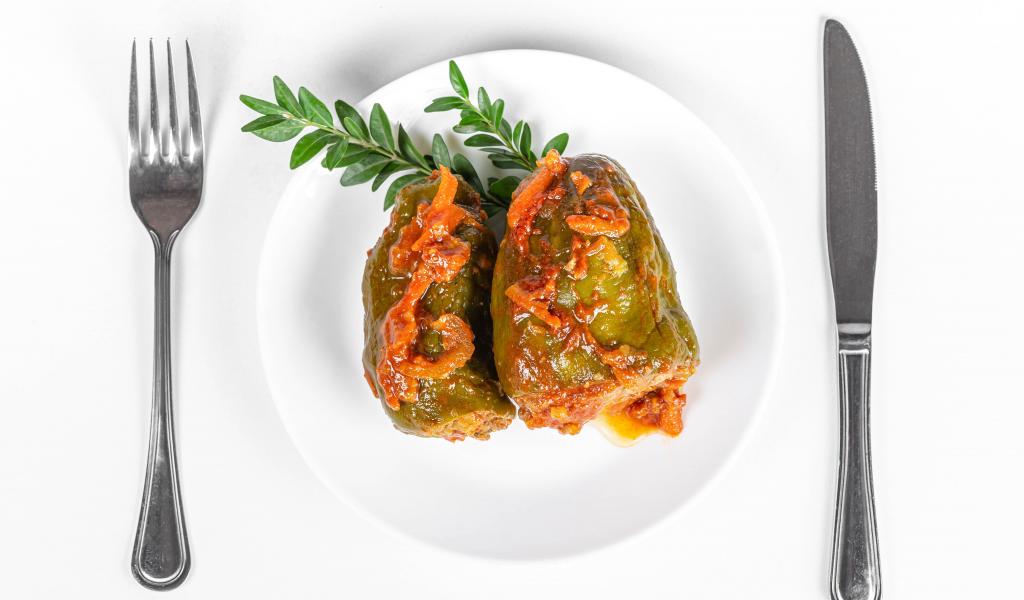 Wallpaper Stuffed peppers on a white plate with cutlery