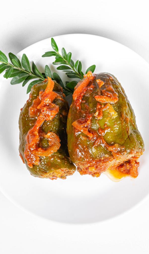 Wallpaper Stuffed peppers on a white plate with cutlery
