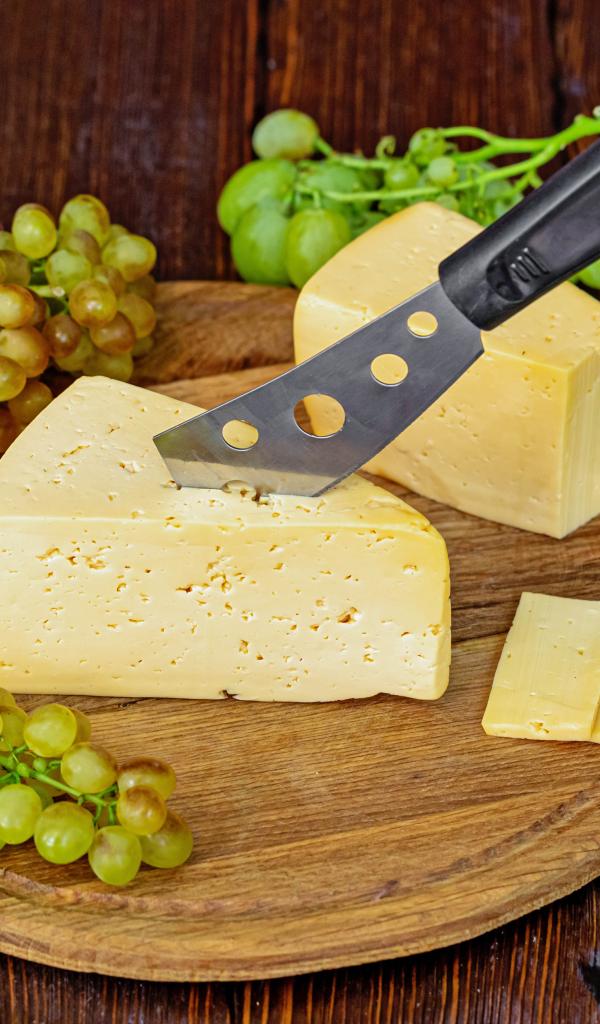 Wallpaper A piece of hard cheese on a table with a knife and white grapes