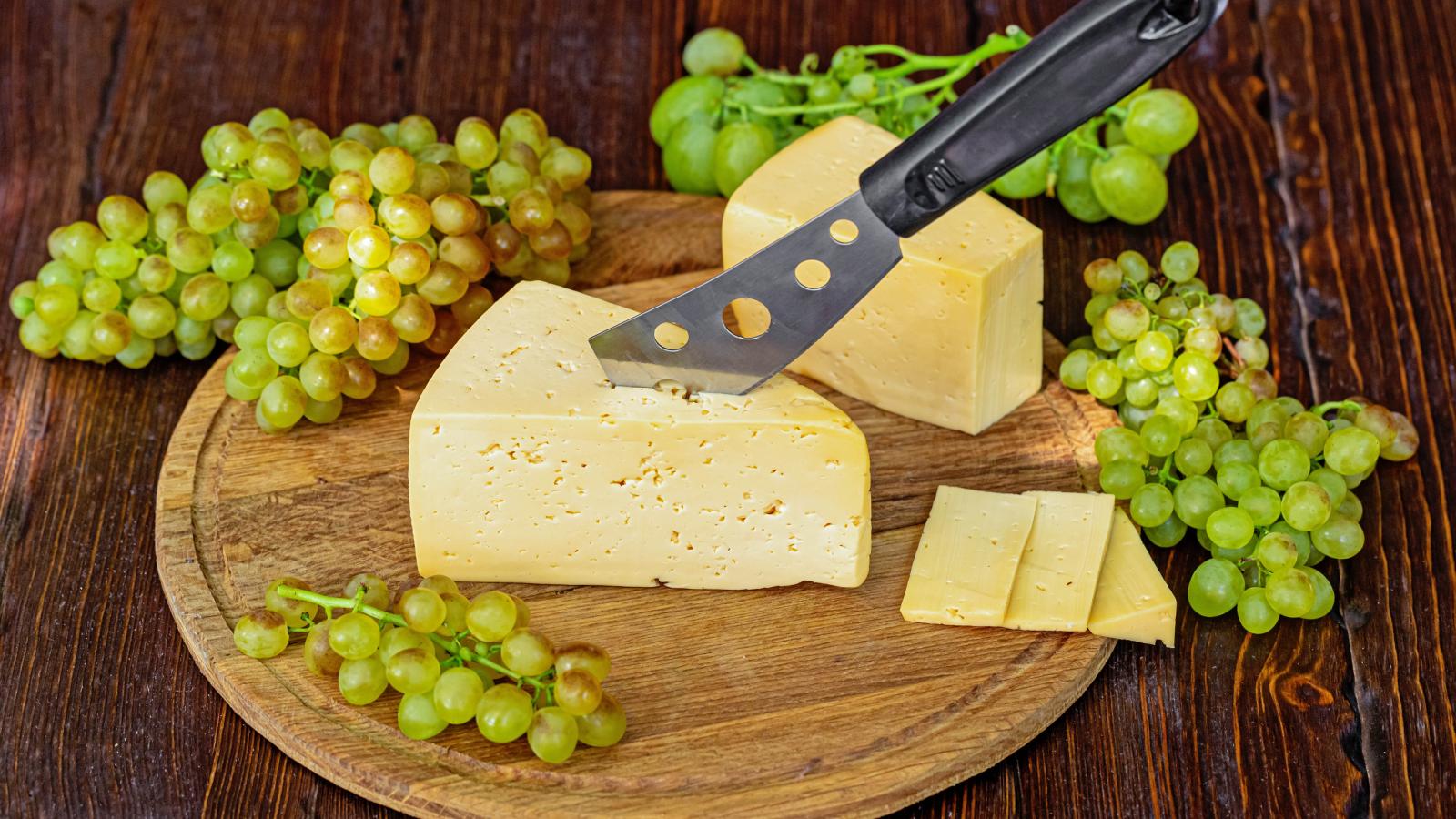 Wallpaper A piece of hard cheese on a table with a knife and white grapes