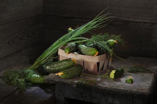 Wallpaper Fresh cucumbers on the table with green onions and dill