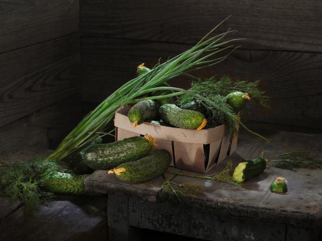 Wallpaper Fresh cucumbers on the table with green onions and dill