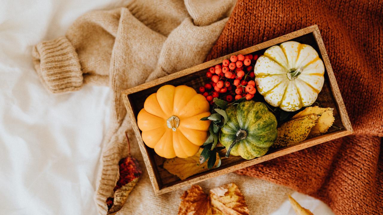 Wallpaper Decorative pumpkin in a box on a table with rowan