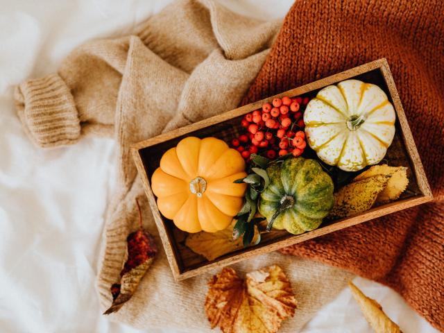 Wallpaper Decorative pumpkin in a box on a table with rowan