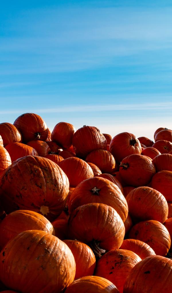Wallpaper A lot of ripe orange pumpkin on the field against the blue sky