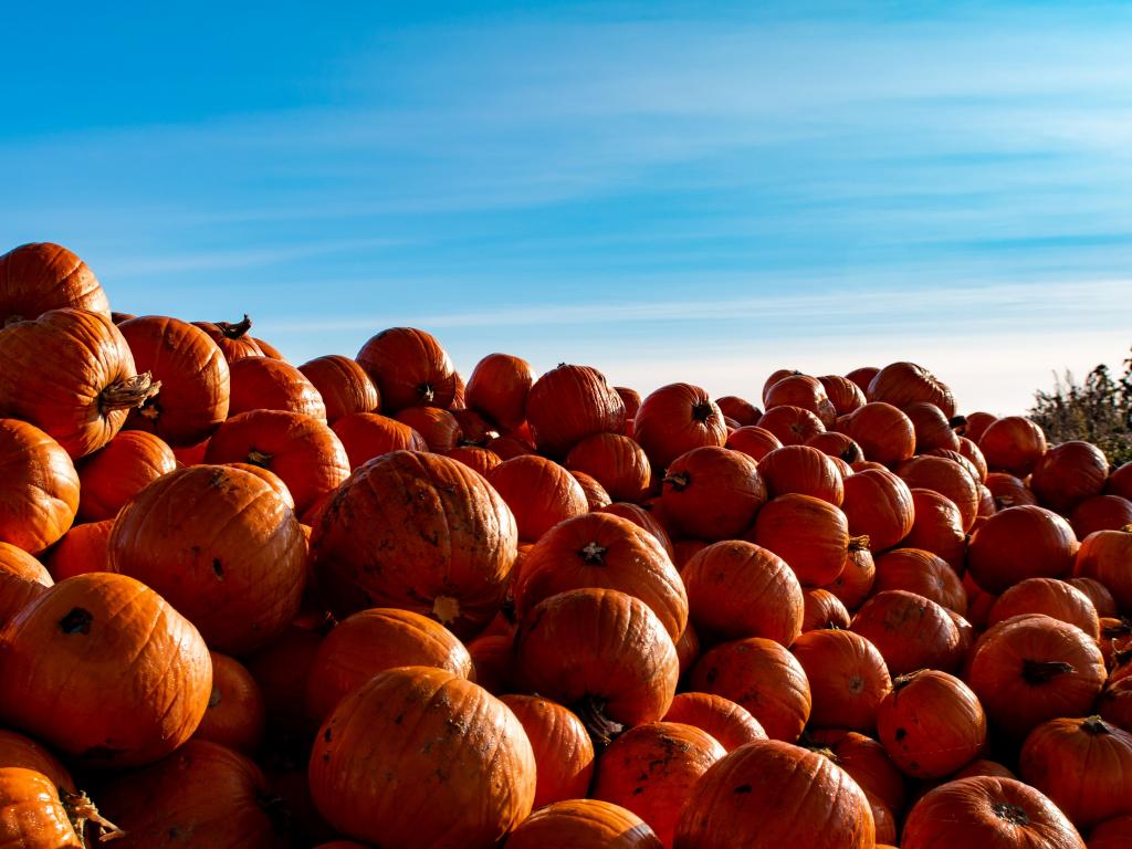 Wallpaper A lot of ripe orange pumpkin on the field against the blue sky