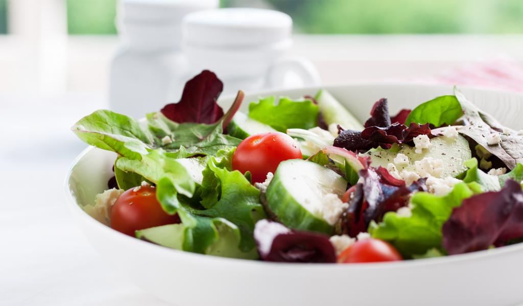 Wallpaper Appetizing salad with fresh cucumbers, tomatoes and cheese