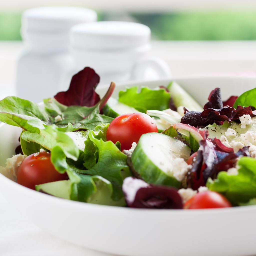 Wallpaper Appetizing salad with fresh cucumbers, tomatoes and cheese