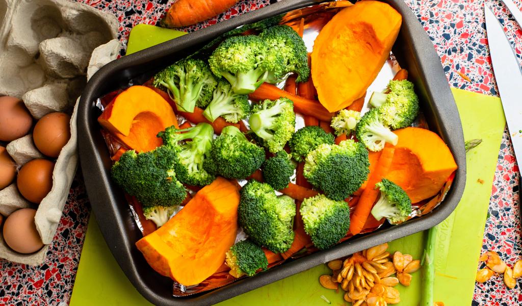 Wallpaper Fresh broccoli, carrots and pumpkin on a baking sheet
