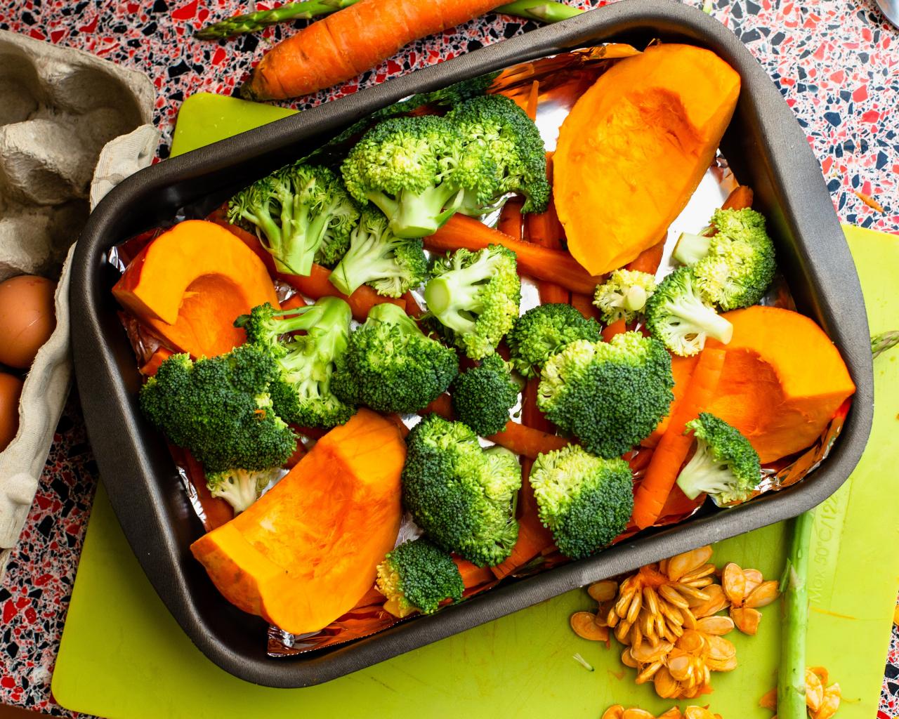 Wallpaper Fresh broccoli, carrots and pumpkin on a baking sheet