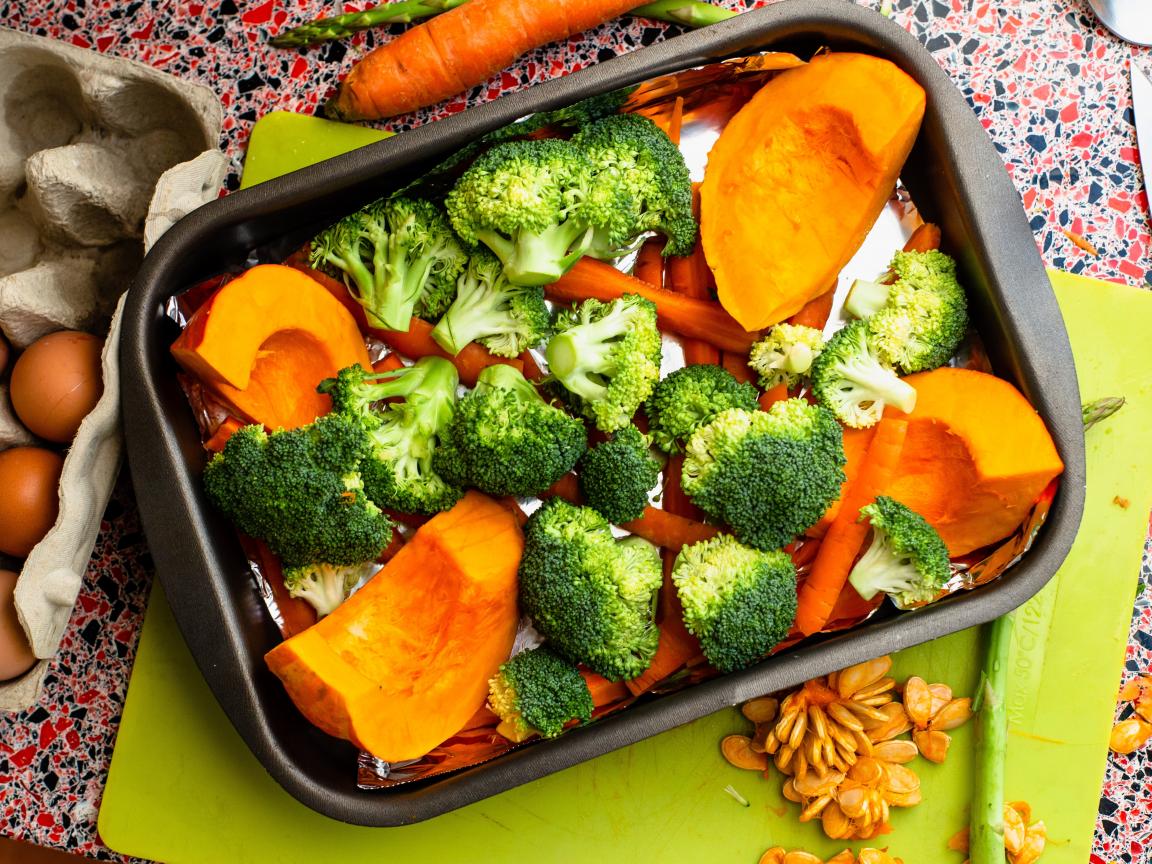 Wallpaper Fresh broccoli, carrots and pumpkin on a baking sheet