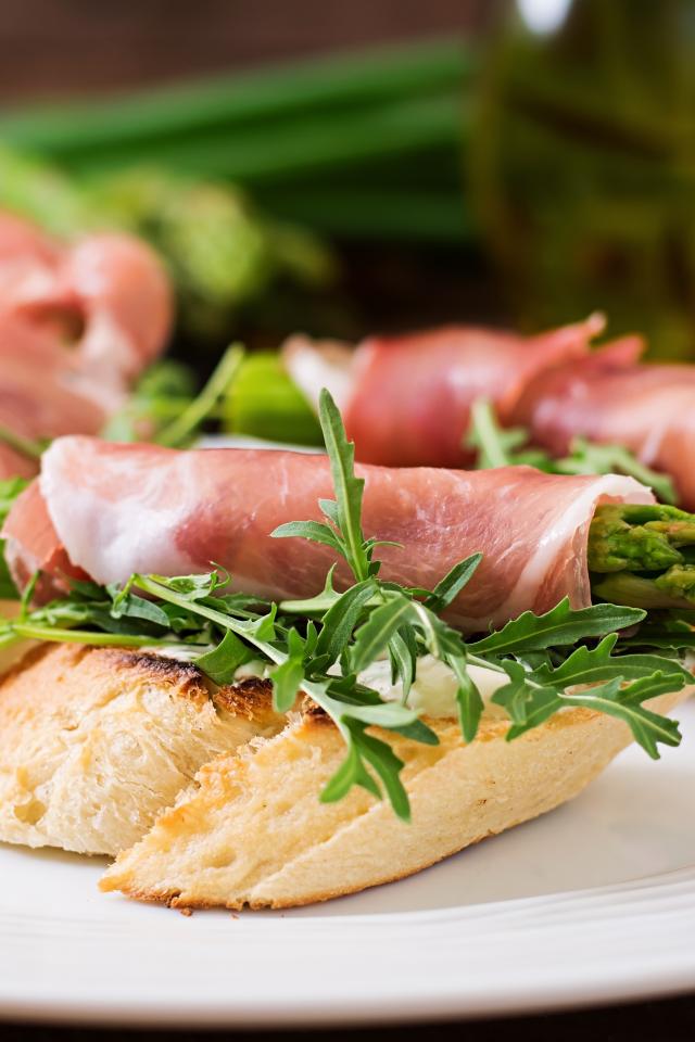 Wallpaper Bacon and asparagus rolls on a plate with croutons