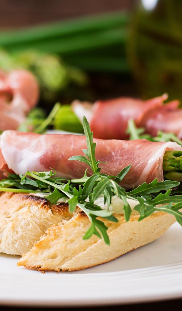 Wallpaper Bacon and asparagus rolls on a plate with croutons