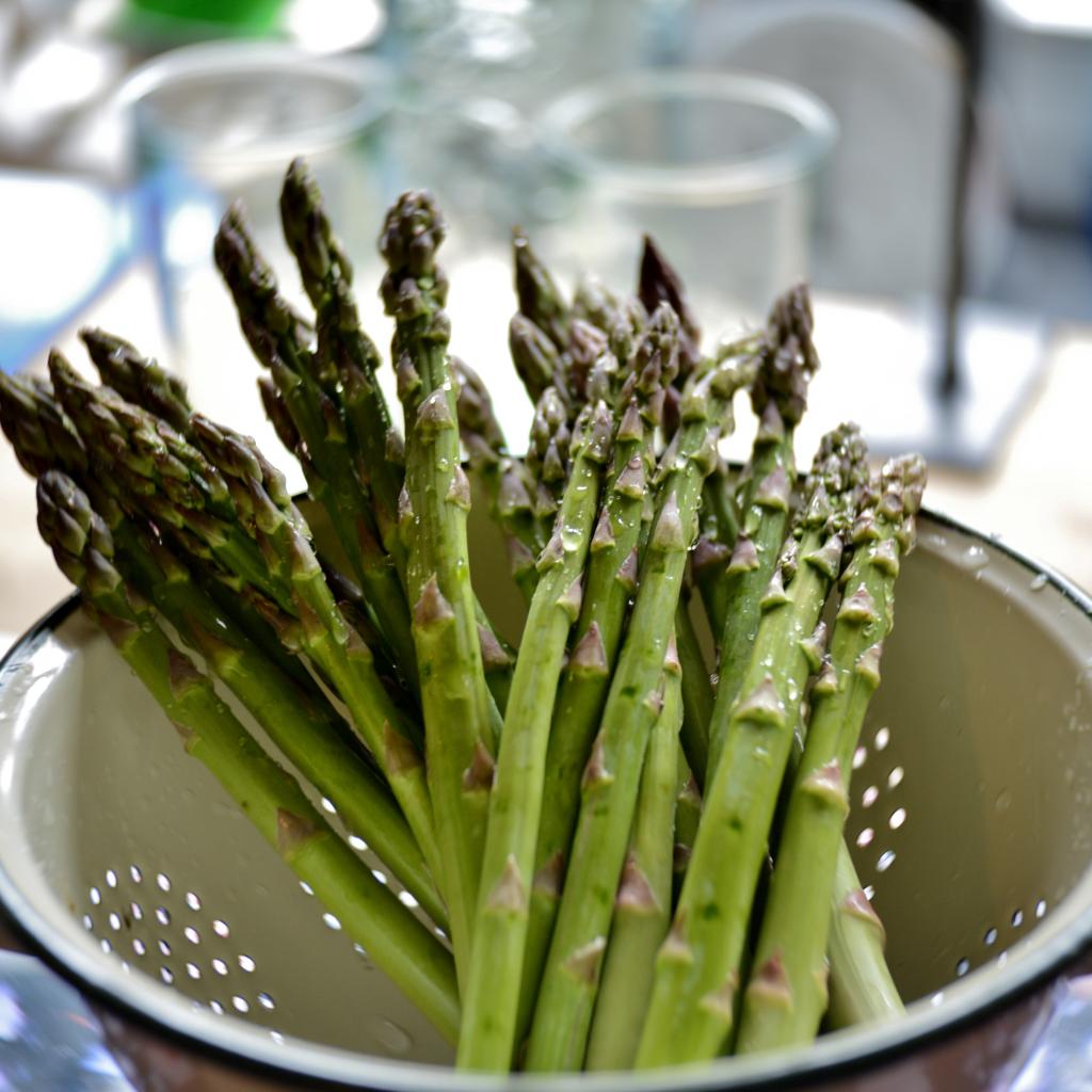 Wallpaper Bacon and asparagus rolls on a plate with croutons