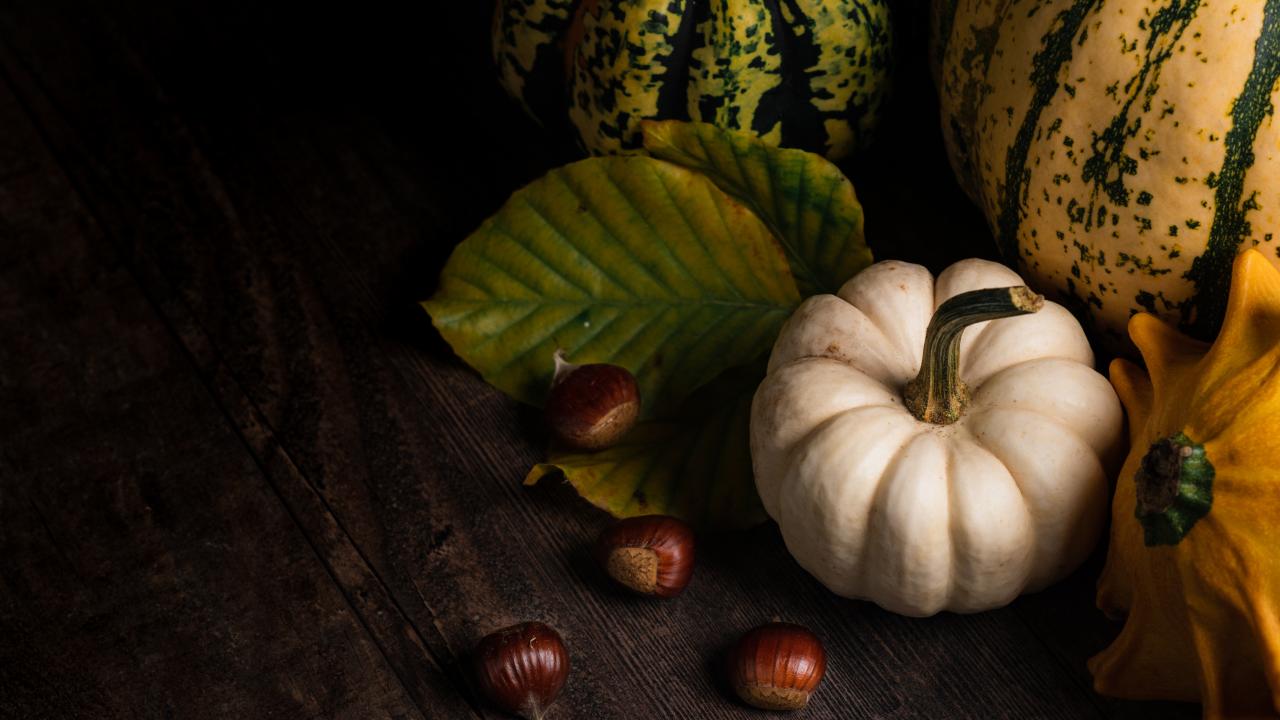 Wallpaper Pumpkin with chestnuts on a wooden table