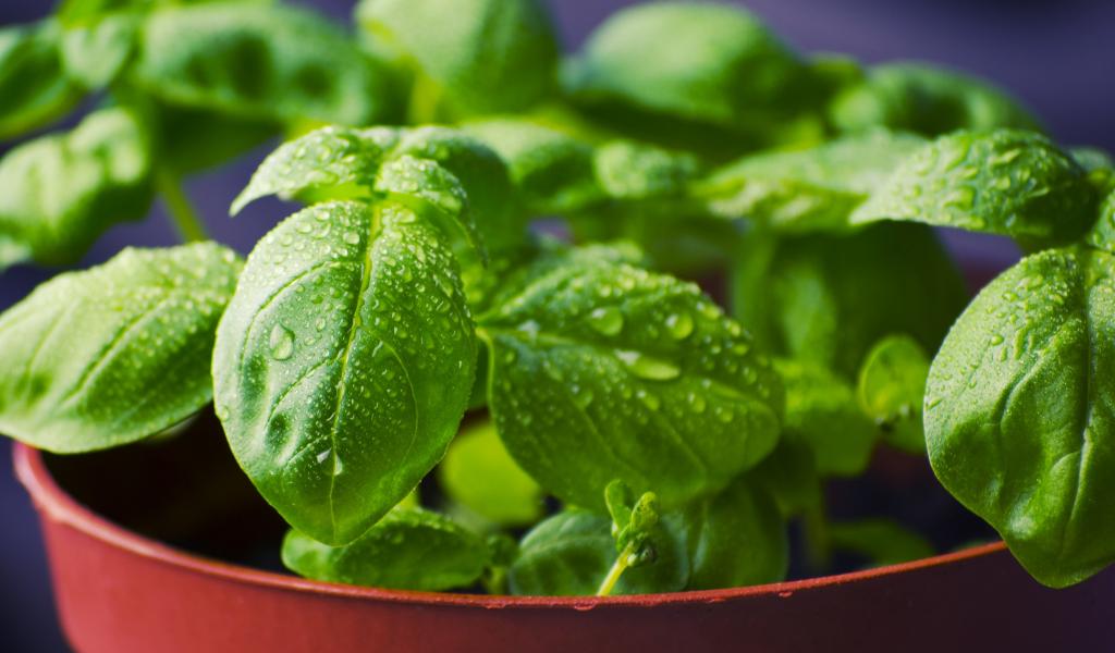 Wallpaper Green basil leaves in dew drops in a pot