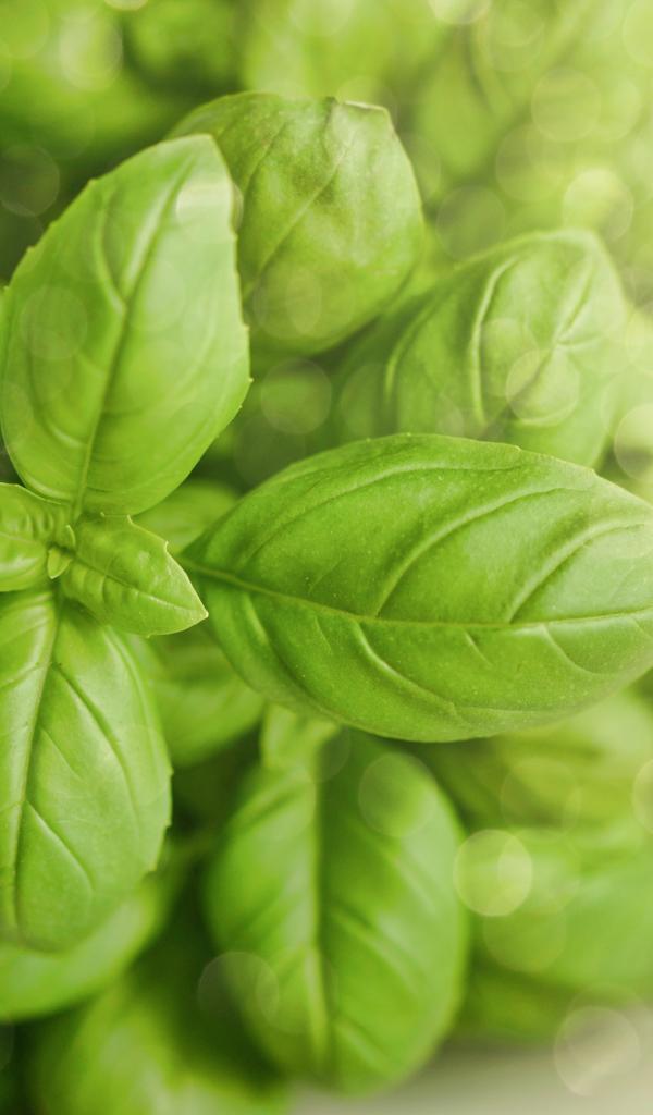 Wallpaper Pizza with bacon and green basil leaves on a table